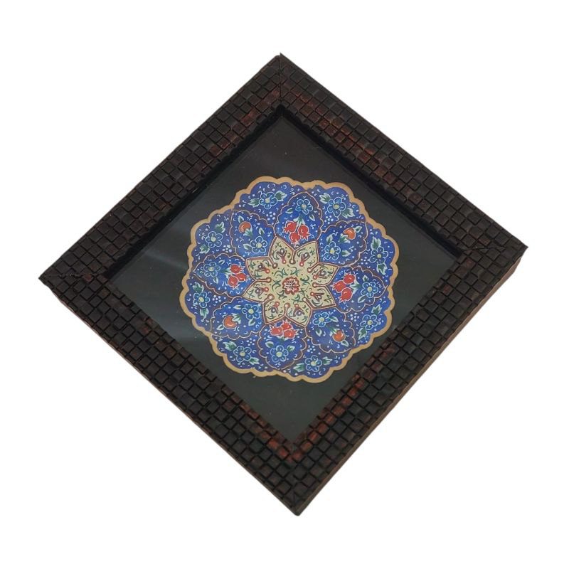 بشقاب میناکاری دیوارکوب 10 سانتی با طرحی خاص و زیبا به رنگ آبی مناسب برای استفاده در ویترین و دکور و نصب روی دیوار همراه با قاب PVC