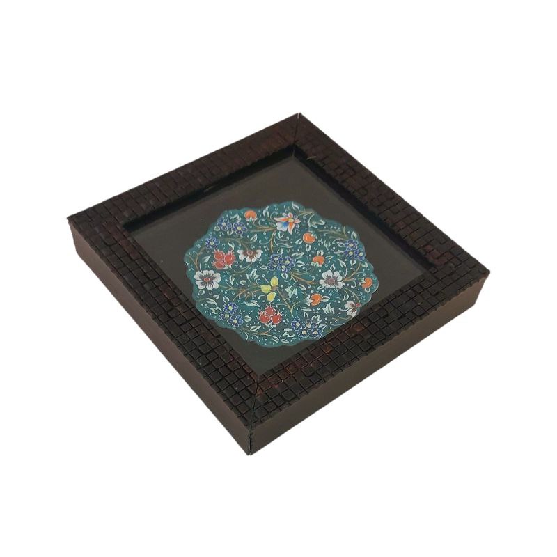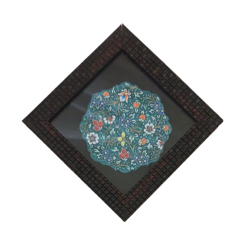 بشقاب میناکاری دیوارکوب 10 سانتی با طرحی خاص و زیبا به رنگ سبز مناسب برای استفاده در ویترین و دکور و نصب روی دیوار همراه با قاب PVC