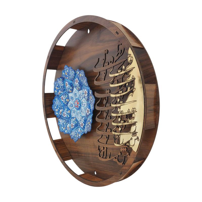 بشقاب میناکاری دیوارکوب 16 سانتی با قاب چوبی لیزری که شعر (طره تویی، بحر تویی، لطف تویی، قهر تویی قند تویی، زهر تویی، بیش میآزار مرا ) از حضرت مولانا با طرحی خاص و زیبا به رنگ آبی مناسب برای استفاده در ویترین و دکور و نصب روی دیوار همراه با قاب چوبی
