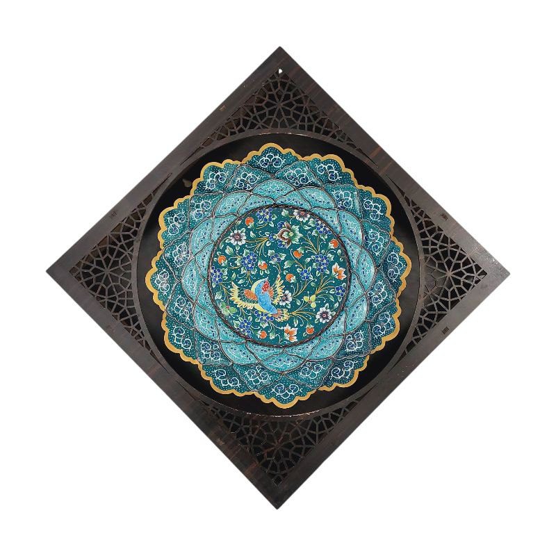 بشقاب میناکاری دیوارکوب 20 سانتی با طرحی خاص و زیبا به رنگ سبز مناسب برای استفاده در ویترین و دکور و نصب روی دیوار با فرم لوزی یا مربع در قاب چوبی لیزری