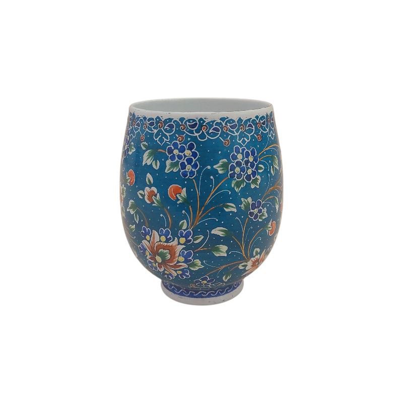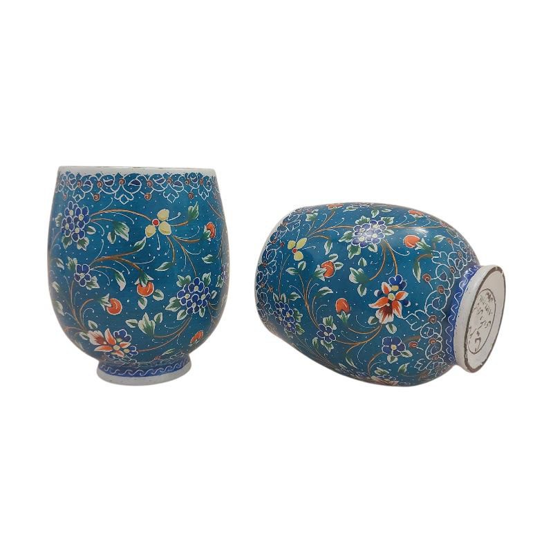 ماگ میناکاری با طرحی خاص و زیبا با ارتفاع 9 سانتی متر و قطر دهانه 6 سانتی متر مناسب برای استفاده در ویترین و دکور مناسب برای پذیرایی برای نوشیدنی های گرم و سرد.