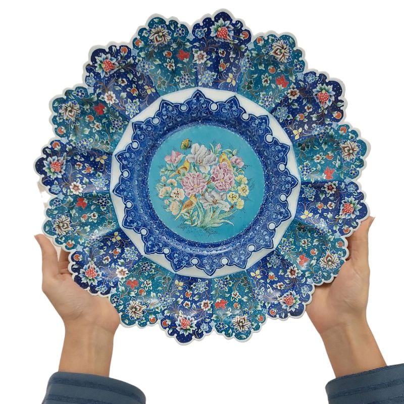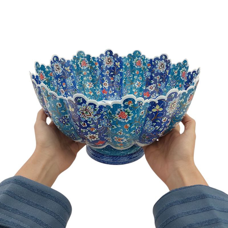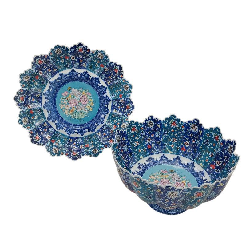 کاسه و بشقاب 35 سانتی میناکاری با طرحی خاص و زیبا که گل ها و پرنده های مرکز بشقاب و کاسه با تکنیک پرداز نقطه ای اجرا شده همراه با طرح اسلیمی خطایی مناسب برای خوردن میوه ، سوپ، دسر و یا قابل استفاده در ویترین و دکور و مناسب برای پذیرایی
