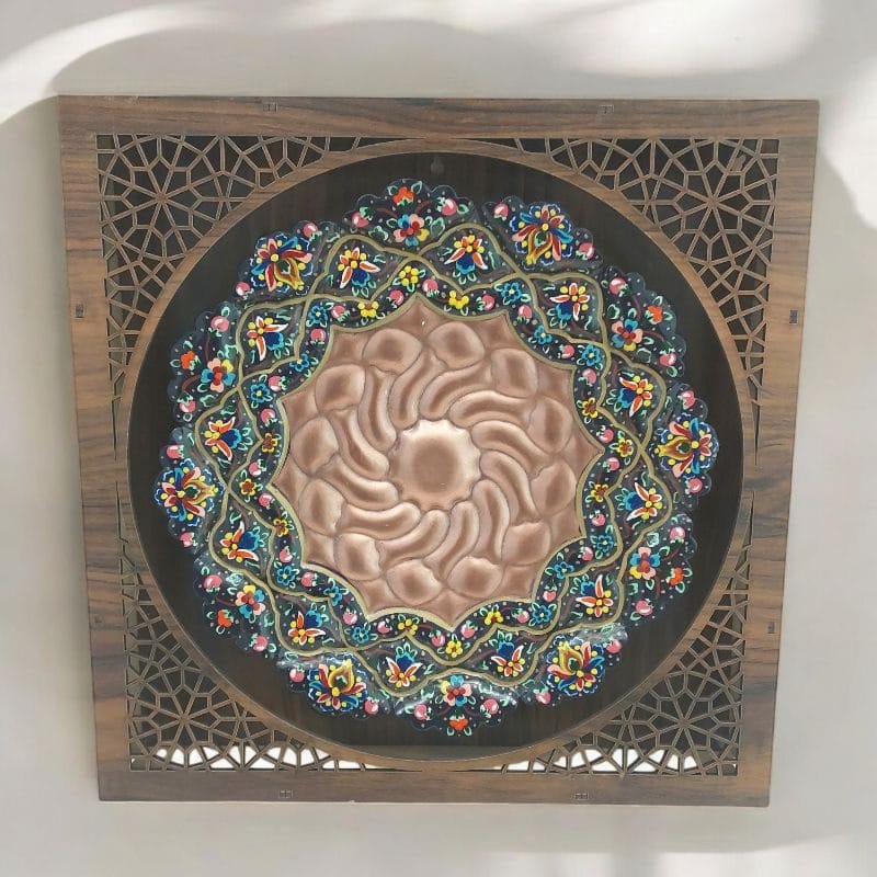 بشقاب مس و پرداز دیوارکوب 25 سانتی با طرحی خاص و زیبا مناسب برای استفاده در ویترین و دکور و نصب روی دیوار به همراه قاب چوبی