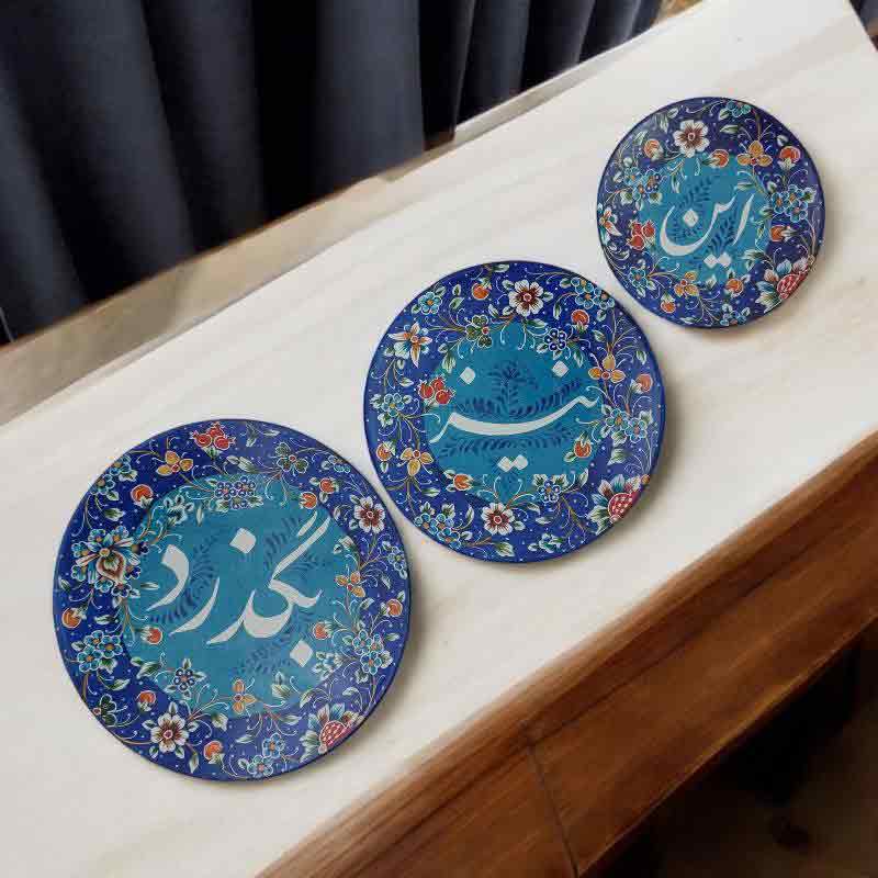 یشقاب میناکاری دیوارکوب شامل 3 عدد بشقاب لب گرد میناکاری شده با قطر 8 و 10 و 12 سانتی متر با خطاطی 3 کلمه “این نیز بگذرد” روی هرکدام از بشقاب ها با طرحی خاص و زیبا مناسب برای استفاده در ویترین و دکور و دارای حلقه فلزی برای نصب روی دیوار