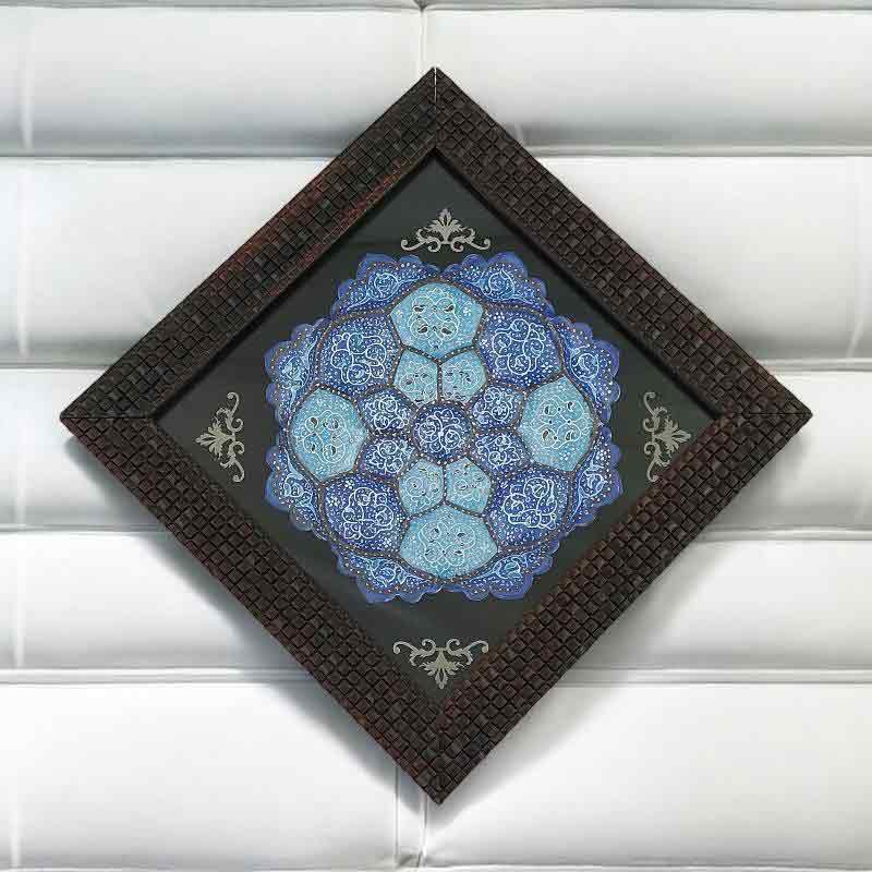 بشقاب میناکاری دیوارکوب 16 سانتی با طرحی خاص و زیبا به رنگ آبی مناسب برای استفاده در ویترین و دکور و نصب روی دیوار همراه با قاب pvc