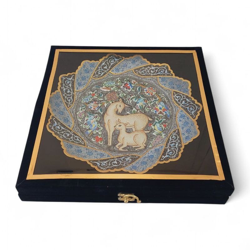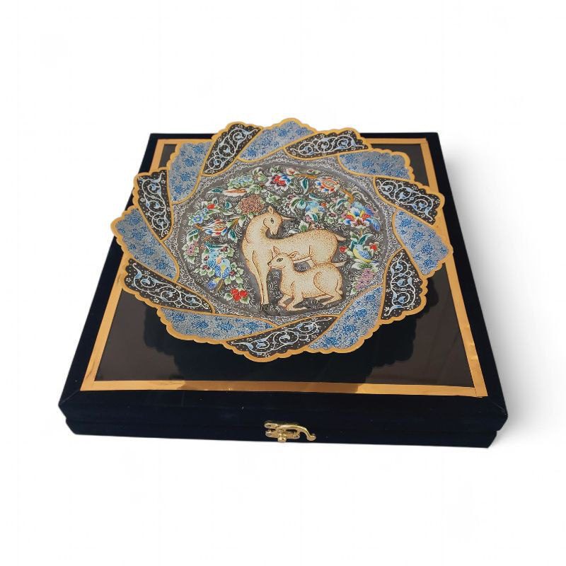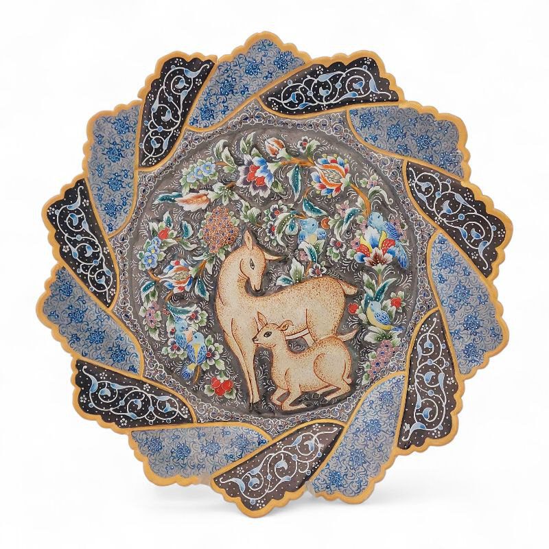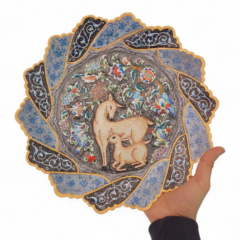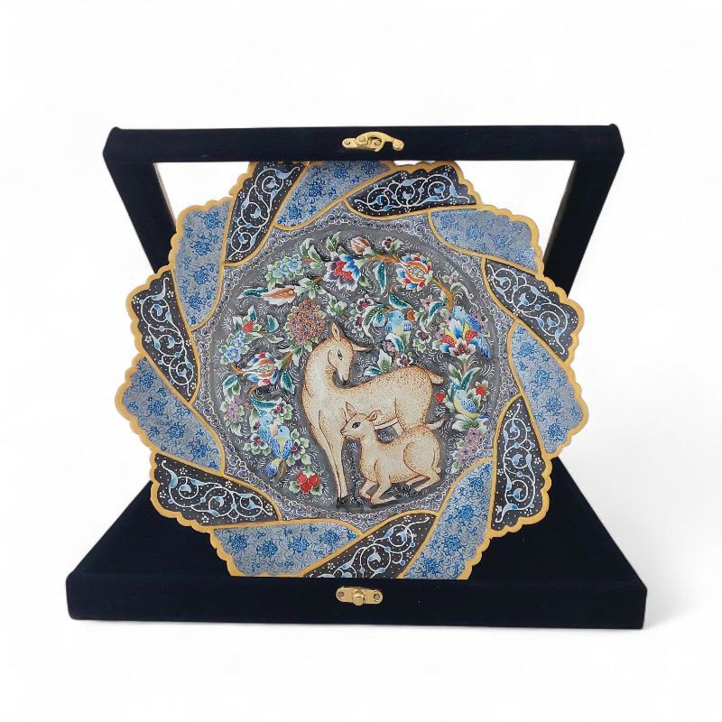 بشقاب میناکاری دیوارکوب با قطر 30 سانتی با طرح خاص و زیبا و نقوش برجسته آهو و گل ها با استفاده از تکنیک پرداز نقطه ای بهمراه قاب PVC شیشه خور مناسب برای استفاده در ویترین و دکور