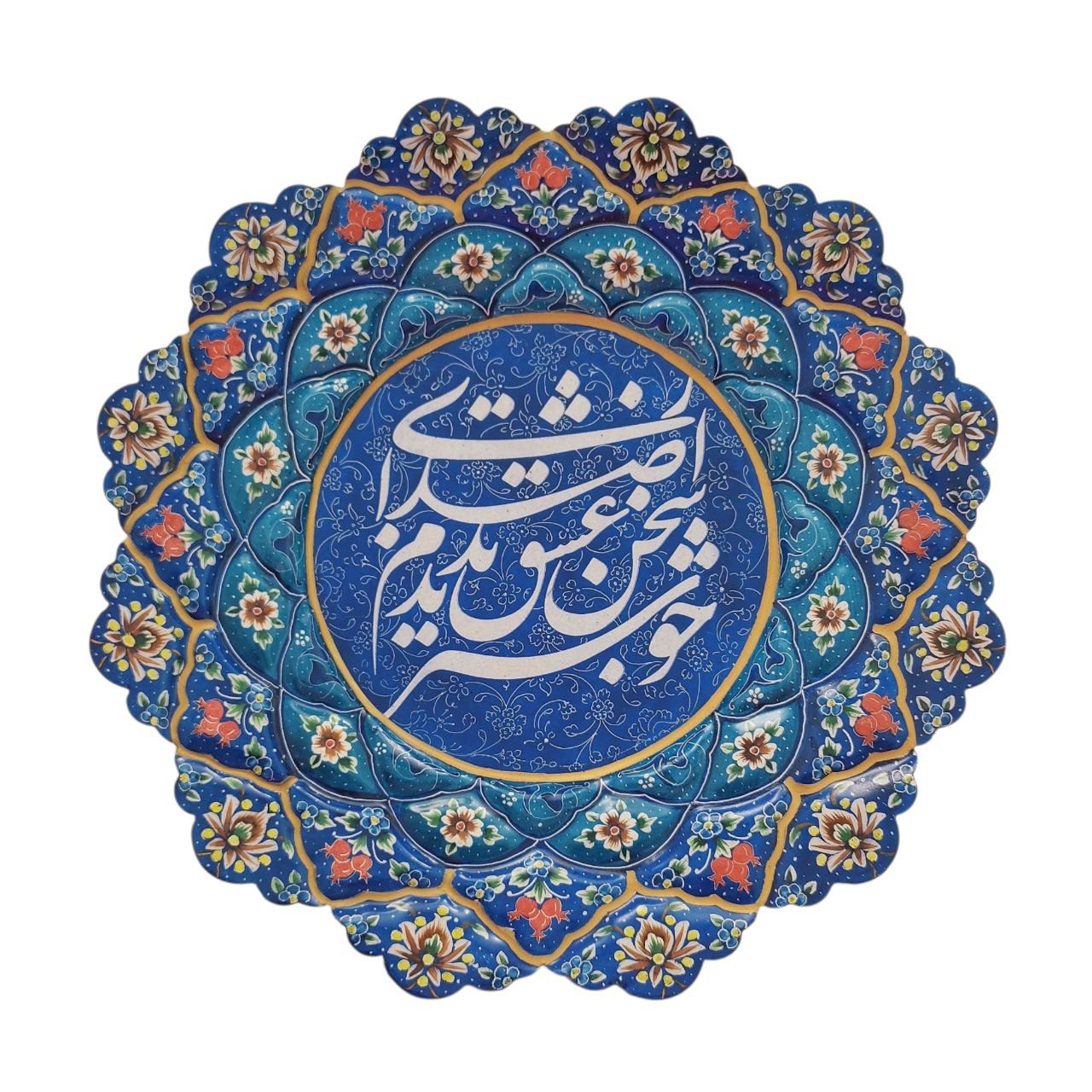 بشقاب میناکاری دیوارکوب 25 سانتی (ابعاد بشقاب) با طرحی خاص و زیبا و خوشنویسی شعر “از صدای سخن عشق ندیدم خوشتر” به رنگ آبی که در قاب شکیل شیشه خور PVC نصب شده و مناسب برای استفاده در ویترین و دکور و نصب روی دیوار است.
