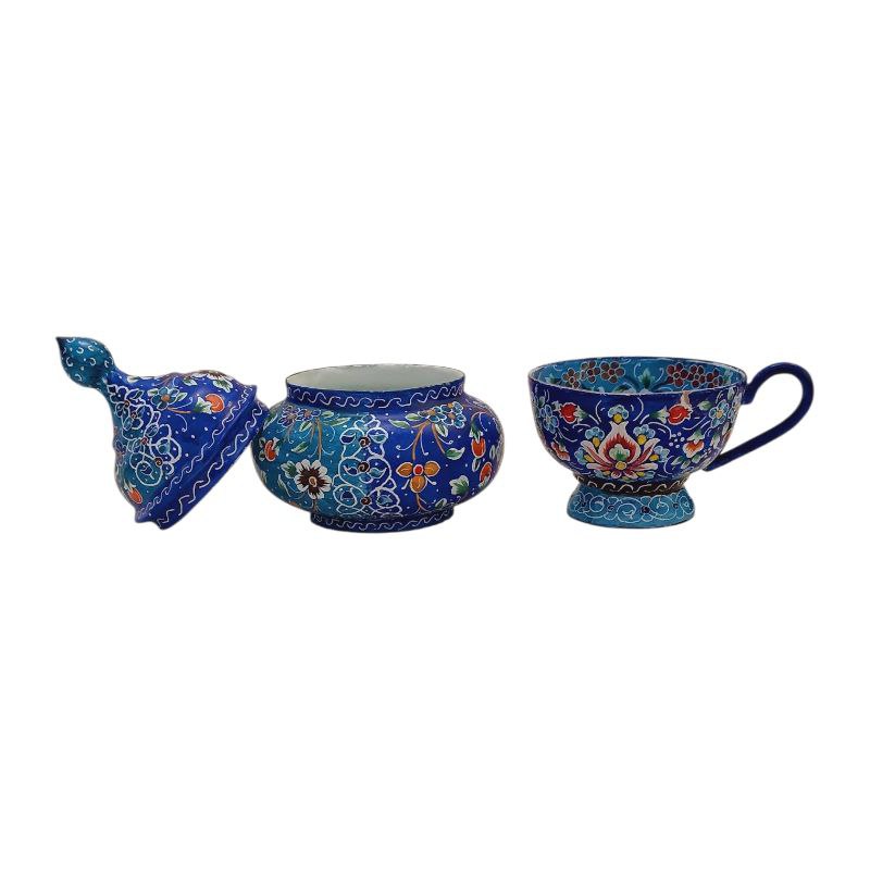 ست قهوه خوری میناکاری با طرحی خاص و زیبا به رنگ آبی مناسب برای استفاده در ویترین و دکور و همچنین قابل شست و شو و استفاده ی کاربردی