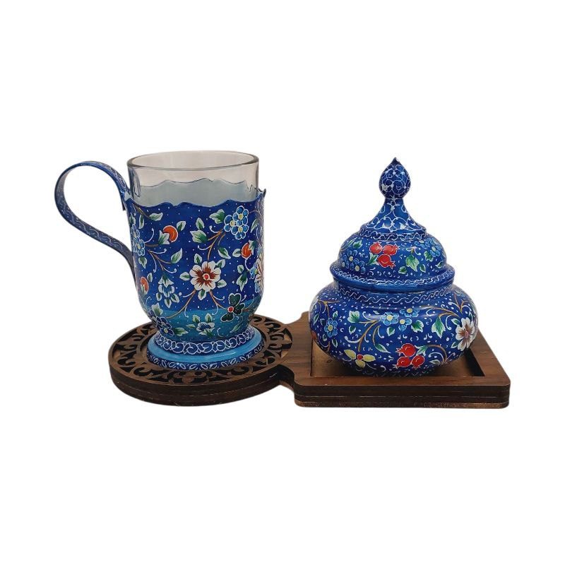 ست گالش و استکان قهوه و چای خوری و قندان میناکاری با طرحی خاص و زیبا به رنگ آبی همراه با سینی چوبی مناسب برای استفاده در ویترین و دکور و همچنین قابل شست و شو و استفاده ی کاربردی