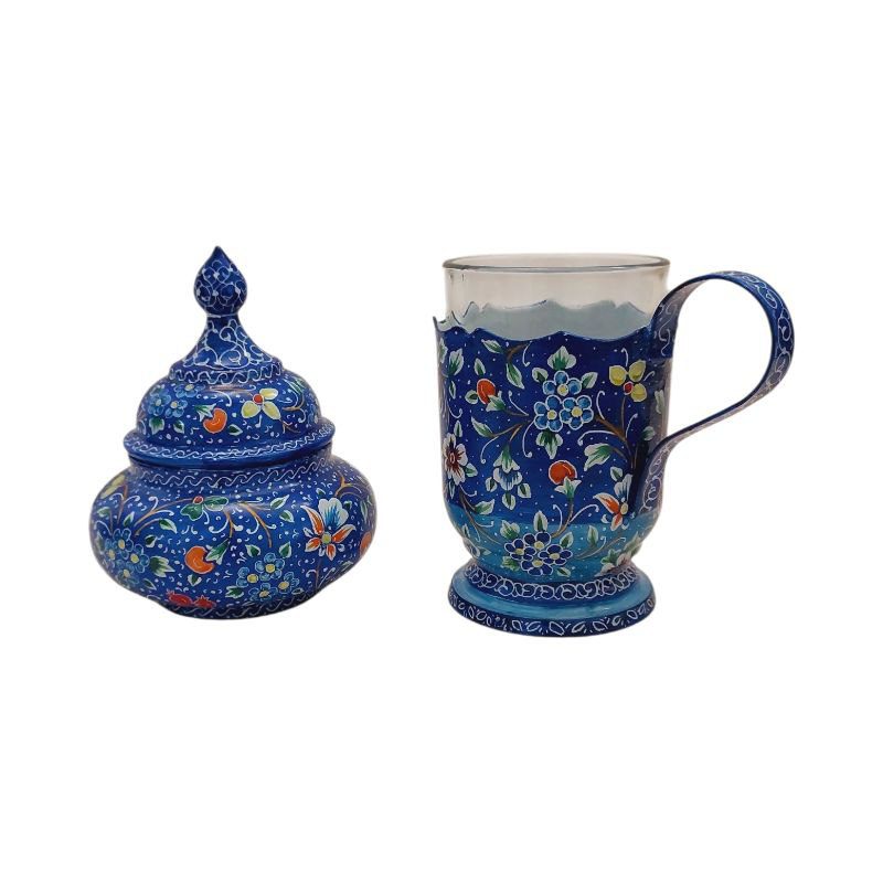 ست قهوه و چایی خوری میناکاری با طرحی خاص و زیبا به رنگ آبی مناسب برای استفاده در ویترین و دکور و همچنین قابل شست و شو و استفاده ی کاربردی