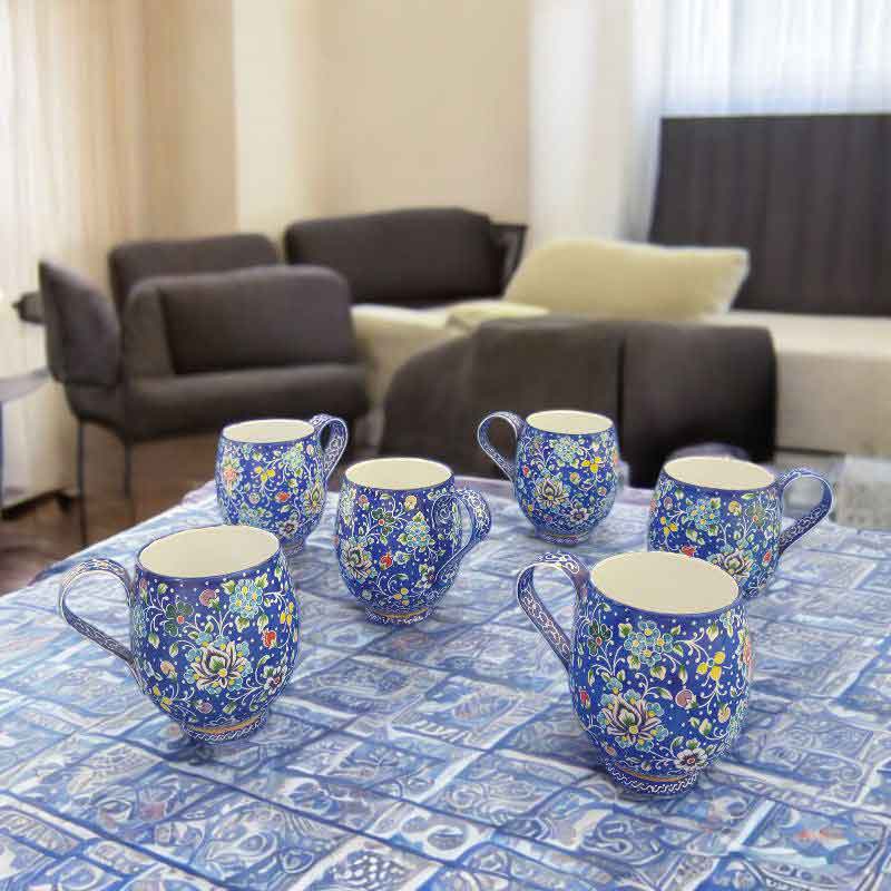 ست 6 عددی ماگ میناکاری با طرحی خاص و زیبا با رنگ آبی با ارتفاع 11 سانتی متر (با احتساب دسته) و قطر دهانه 6 سانتی متر مناسب برای استفاده در ویترین و دکور مناسب برای پذیرایی برای نوشیدنی های گرم و سرد.