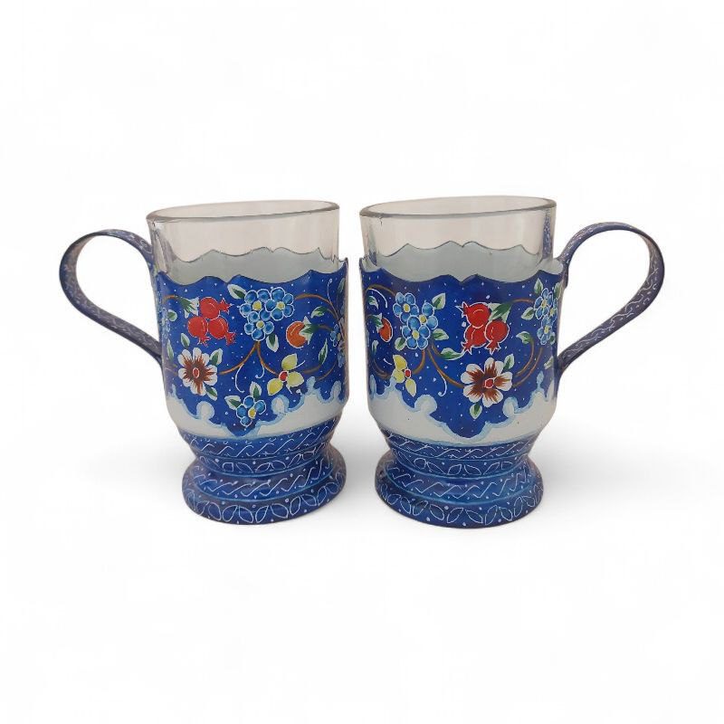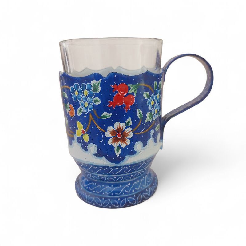 سرویس چای خوری میناکاری با طرحی خاص و زیبا به رنگ آبی شامل 6 عدد گالش و استکان شیشه ای و سینی مناسب برای استفاده در ویترین و دکور و قابل شست و شو و استفاده روزانه