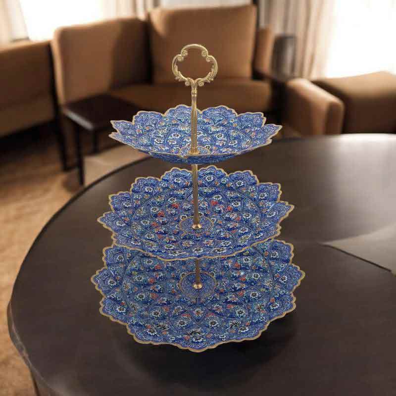 شیرینی خوری میناکاری 3 طبقه با 3 بشقاب 20 و 25 و 30 سانتی متری با طرحی خاص و زیبا همراه با طرح اسلیمی خطایی مناسب برای استفاده در ویترین و دکور و مناسب برای پذیرایی