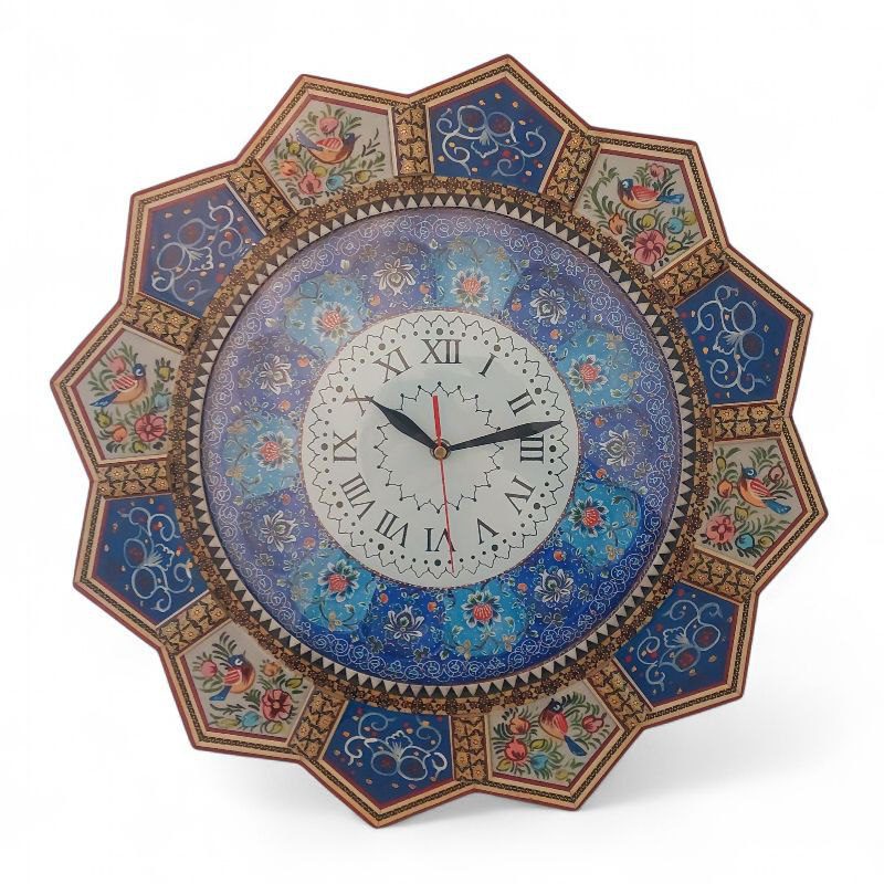 ساعت میناکاری دیوارکوب با قاب خاتم کاری شده با طرحی خاص و زیبا به رنگ آبی مناسب برای استفاده در ویترین و دکور و قابل نصب روی دیوار