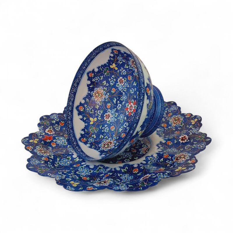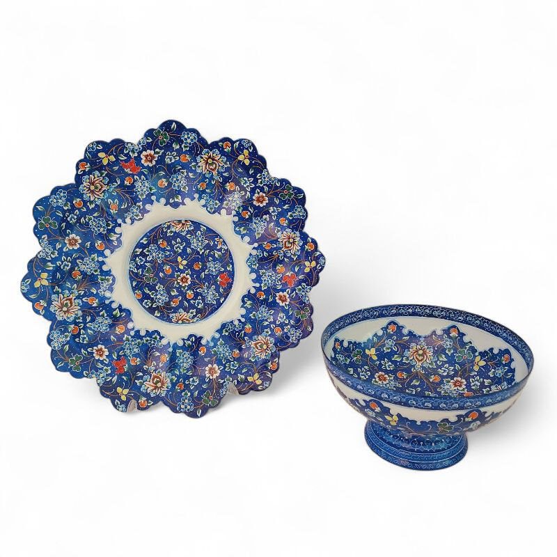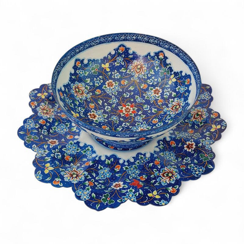 کاسه و بشقاب میناکاری با طرحی خاص و زیبا به رنگ آبی مناسب برای استفاده در ویترین و دکور و مناسب برای پذیرایی