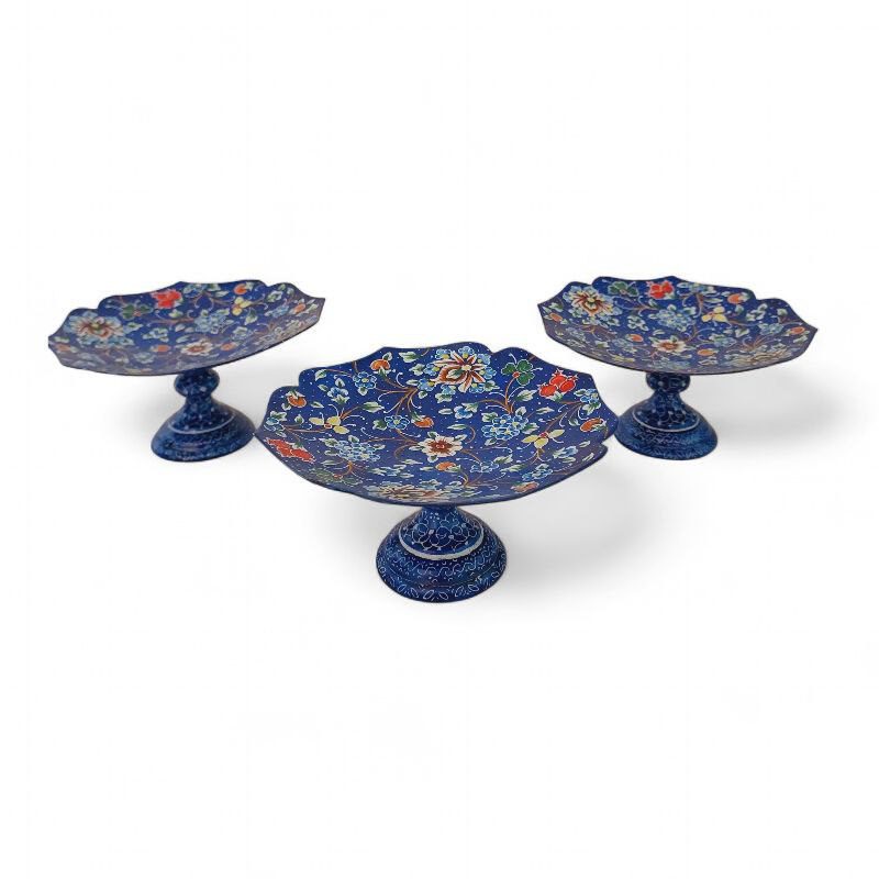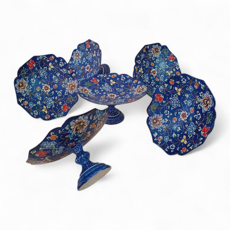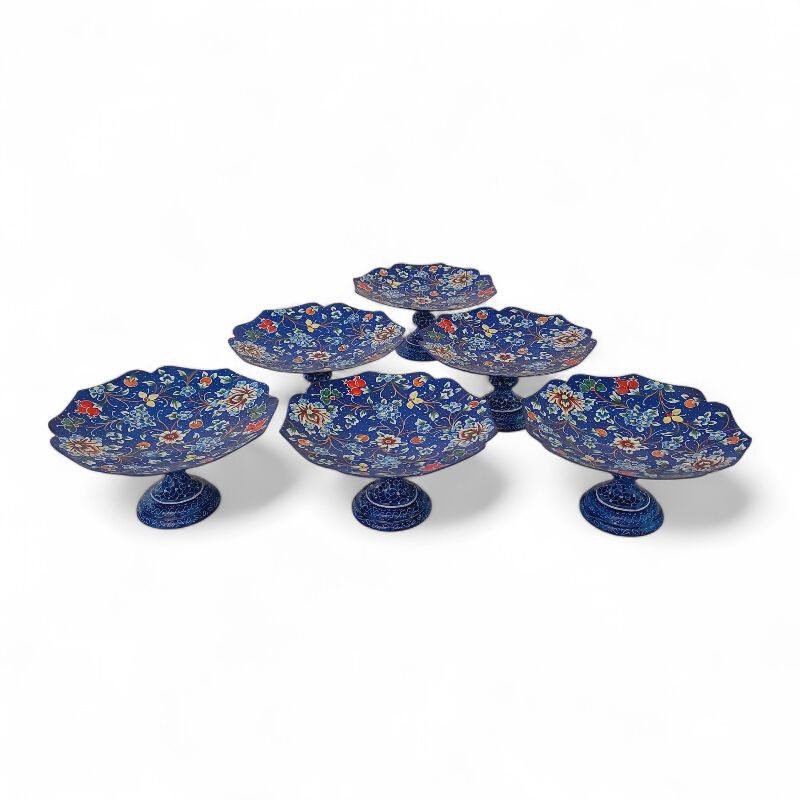 ست 6 عددی کاسه پایه دار میناکاری با طرحی خاص و زیبا به رنگ آبی مناسب برای استفاده در ویترین و دکور و مناسب برای پذیرایی
